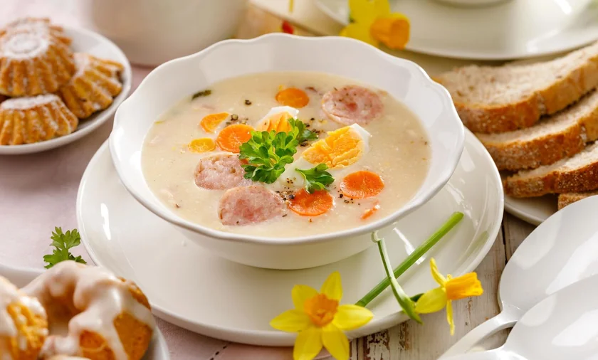 żurek, czyli zupa gotowana na bazie zakwasu z razowej mąki żytniej. Żurek jest